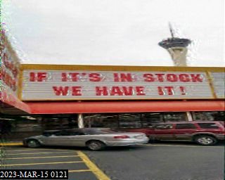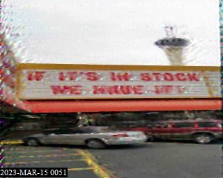 0121: SSTV - pic of store and cars, with sign lettering "IF ITS IN STOCK -  WE HAVE IT", -> ID then off