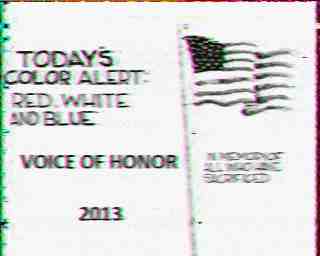 Voice of Honor 6925 usb 23:15 SIO 253  CW and SSTV at sign on. CW: Cq Cq voice of Honor Happy Memorial Day. SSTV Black and white image of American Flag with “ Today's Color Alert- Red, White and Blue.”