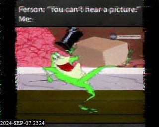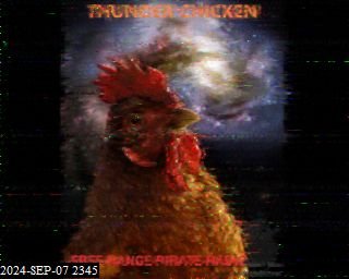 0000 Fanfare, SSTV, 'Rooster Rag', 'Rag Top Down' … 0019 'The Blues Keep Coming', thanking folks for the "fantastic reports" playing songs near the end from favorite album "Playing for Columbus" album, 'Join the Band (Live)', SSTV (didn't decode here), ''Time Loves a Hero', 'Mercenary Territory', 'Time Loves a Hero', "We're gonna wrap it up pretty quick." sending out a couple more, 'Dixie Chicken (Live), 'Rocket In My Pocket', 'Spanish Moon', "I really like this song.", 'Willin' ', - all music by Little Feat, 'Happy Trails' - Van Halen, clucking, "You are listening to Thunder chicken Radio." Pause. "That's about it." Off 0113.